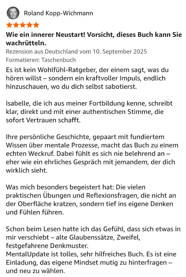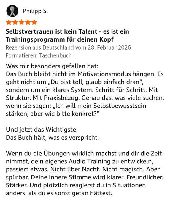 Selbstbewusstsein und Selbstvertrauen sind keine angeborenen Talente, sondern erlernbare Fähigkeiten. Ich zeige dir in meinem Buch, wie du innere Blockaden, Unsicherheiten, Selbstzweifel und Ängste überwindest, um mutig und selbstbestimmt deinen eigenen Weg zu gehen. Mit meiner bewährten Mental Update Technique® entwickelst du dein persönliches Audio-Mentaltraining, das dein Denken, Fühlen und Verhalten in positive Bahnen lenkt – für ein nachhaltig starkes Ich.